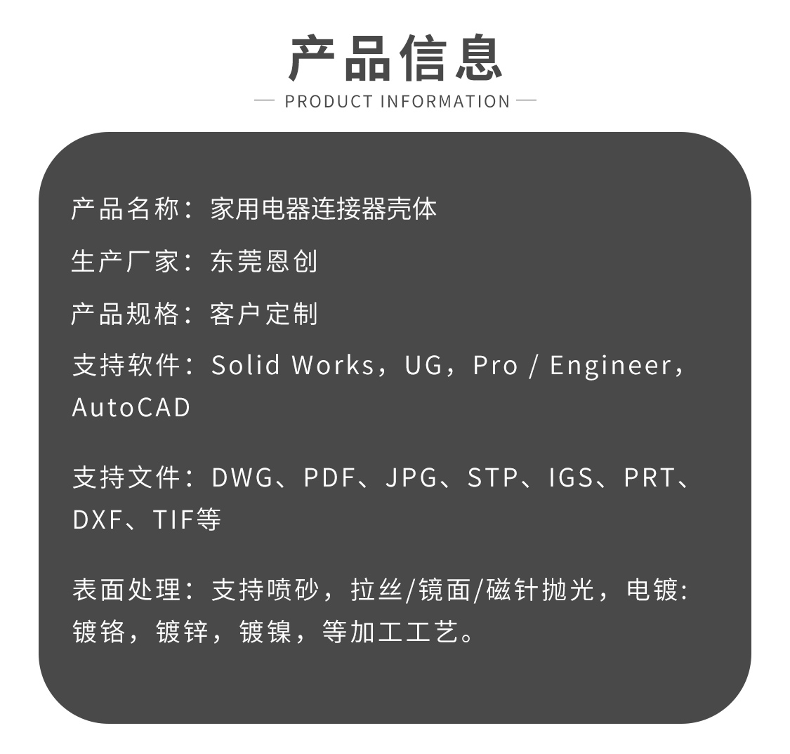 恩創精密五金專業從事鋅合金壓鑄件的生產加工廠,加工產品:連接器外殼,新能源連接器殼體,小家電殼體壓鑄廠,恩創擁有20臺50-300噸壓鑄機,自主開模,所有產品全部目視全檢出貨.